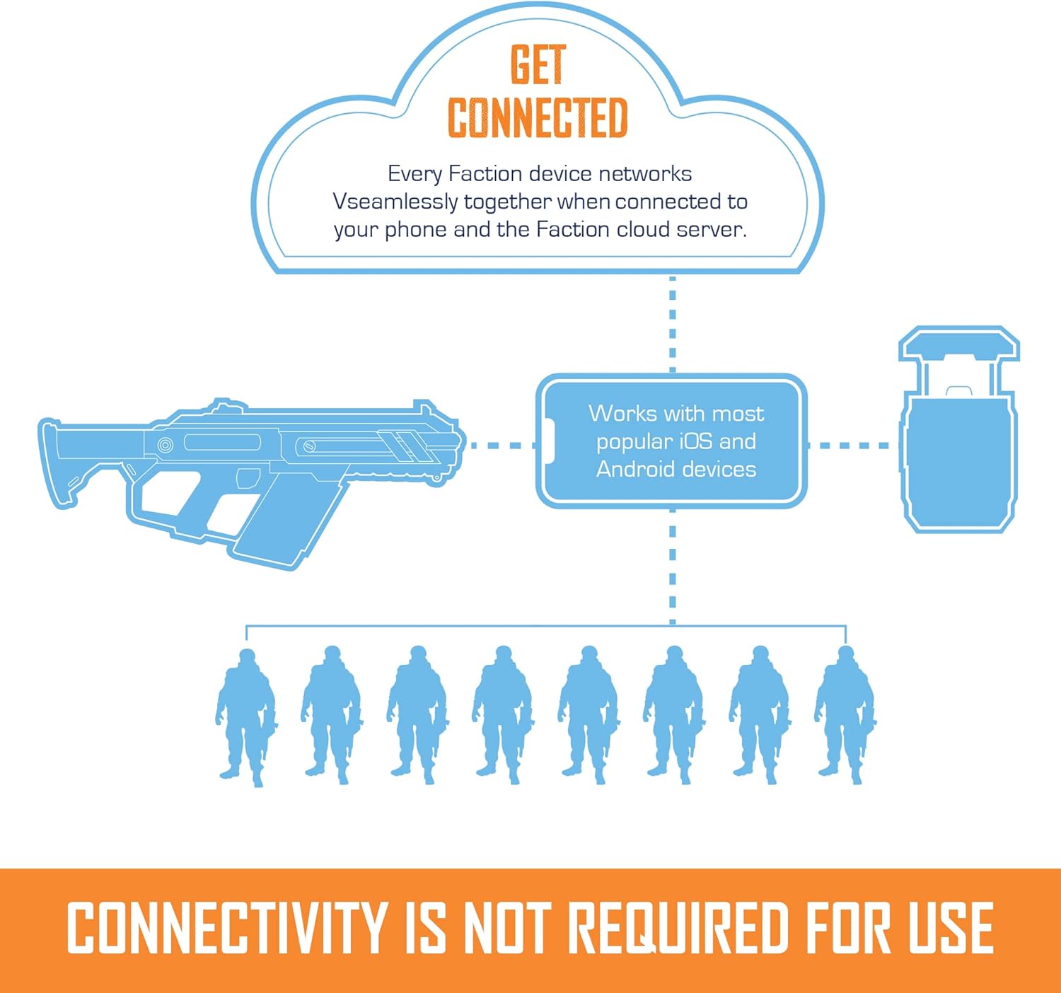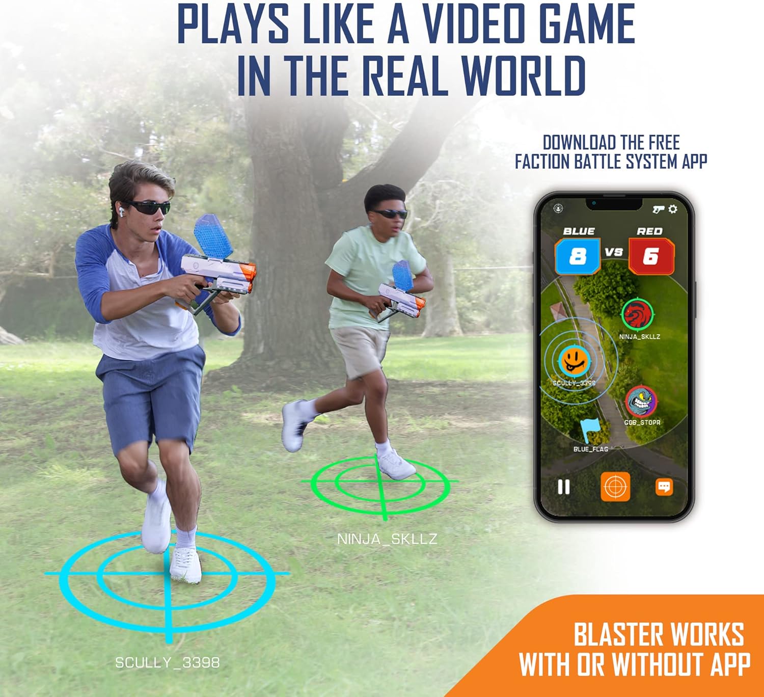 Faction Blaster gel system plays like a video game in the real world! The Havoc blaster has a whopping 230 FPS velocity and a fire rate of 12 beads/second, this blaster holds nothing back. The included ammo clip is not only motorized but can hold 1,750 beads. This blaster can be used with or without the Faction app. Every Faction device networks seamlessly together when connected to your phone and the Faction cloud server. Use headphones (not included) to chat with teammates in real-time. Turn your neighborhood into an interactive arena with GPS tracking and chat. Included is an interactive smart beacon, allowing you to play solo or multiplayer. The smart beacon can be used as a defeat-able tower, target practice, and so much more. With multicolor LEDs and hit detection, single players can use the beacon for interactive target practice. Play blasting games and track stats. Bluetooth enabled.