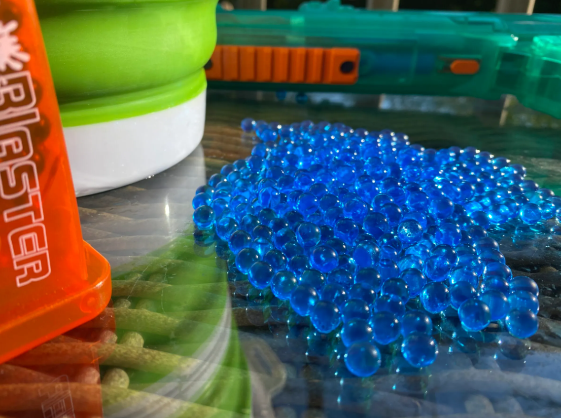 Includes 5,000 7.5 mm water beads that burst on impact and are non-toxic and non-staining for easy cleanup.